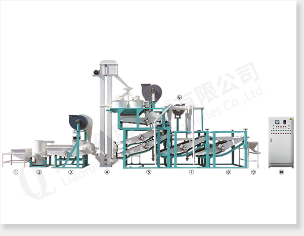 ① input hopper ② spiral elevator ③ multi-functional cleaner ④ bucket elevator ⑤ main part of the equipment(dehullers,air separator and seed-kernel separator) ⑥pneumatic system of back-flowing materials ⑦ seed-kernel reseparator1 ⑧ seed-kernel reseparator2⑨ kernels bin ⑩ electric control cabinet