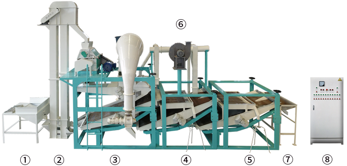 ①приёмный бункер②ковшовый элеватор③главная машина (шелушитель, вибросито для удаления шелухи и вибросито для сепарации нелущённой семечки и крупы)④машина для повторной сепарации нелущённой семечки и крупыⅠ ⑤машина для повторной сепарации нелущённой семечки и крупыⅡ⑥пневматическое подъёмное устройство⑦бункер для сбора крупы⑧электрический управляющий шкаф